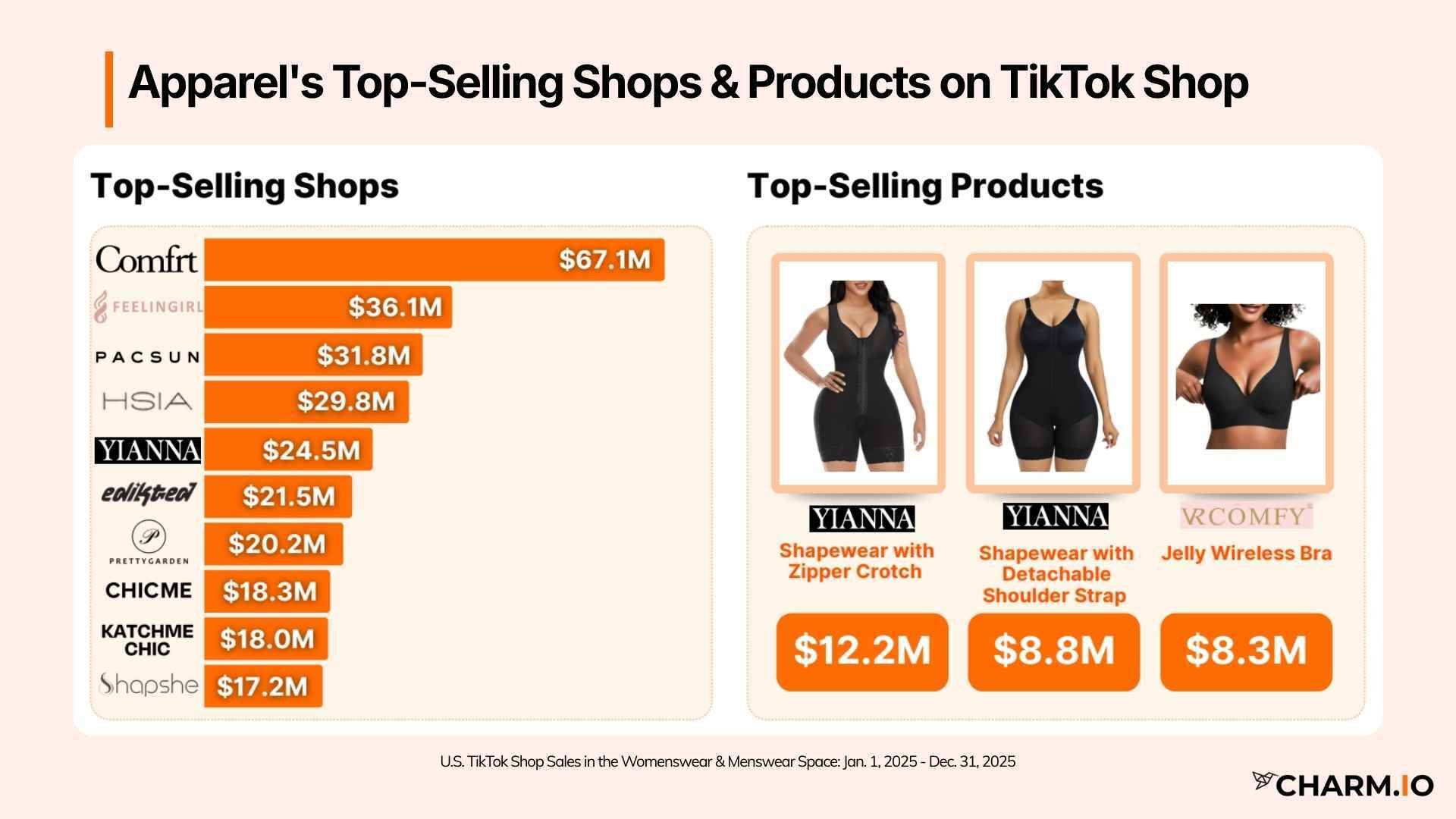 U.S. TikTok Shop data by Charm ranks apparel products by total revenue generated over the full year. With shapewear items leading the list, these products represent the strongest-performing SKUs that consistently drove sales across TikTok Shop in 2025.